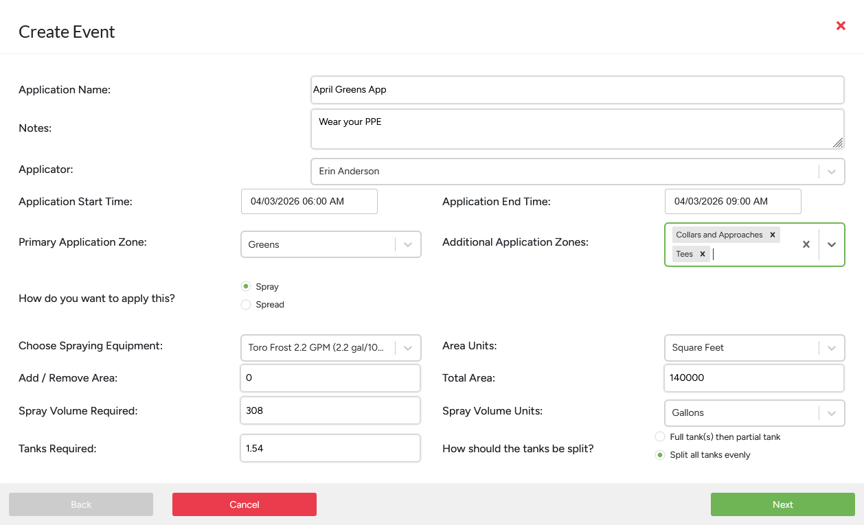 GreenKeeper gives you flexibility when building an application. Configure tanks as full and partial tanks or split them evenly for simpler mixing math. GreenKeeper stores different sprayer setups depending on the mission — greens versus fairways or foliar versus water-in applications.