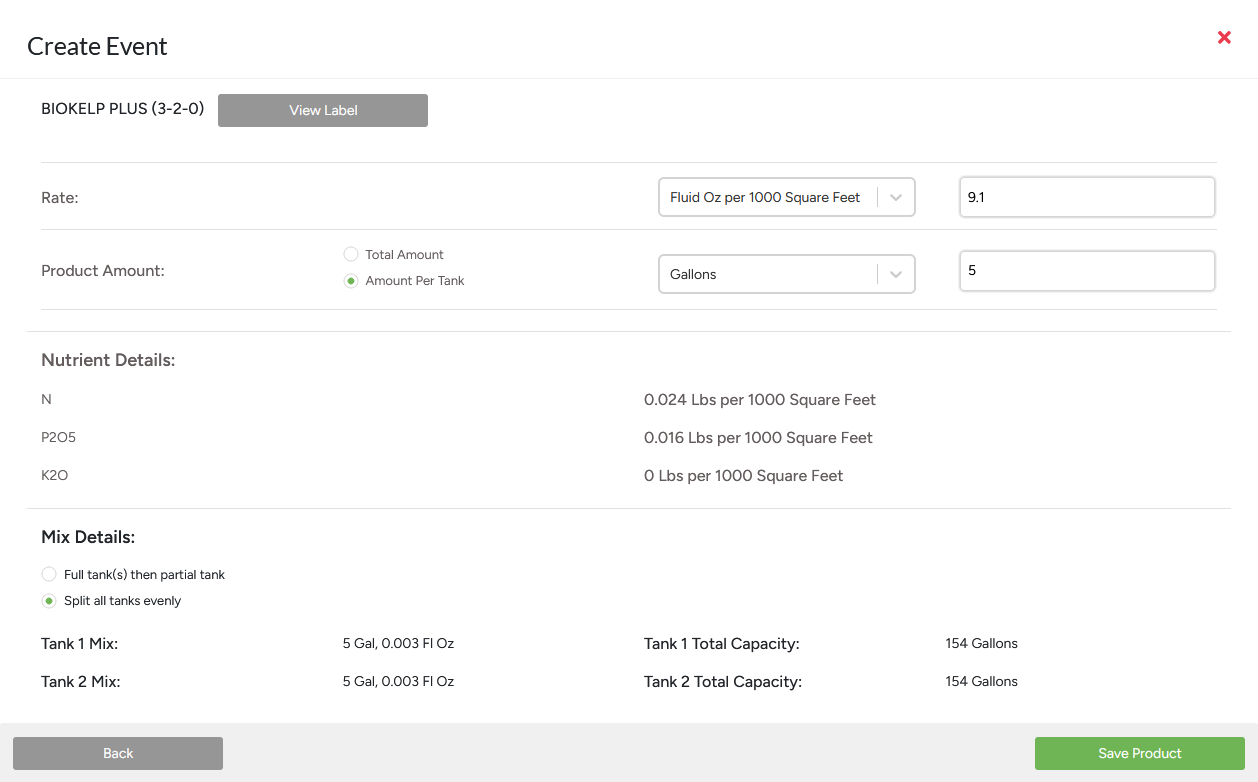 You can work in either direction. Enter a target rate and GreenKeeper calculates product needed, or specify a product amount and back-calculate the rate. That second option is especially useful for fertilizer applications where applying a full 2.5-gallon jug or 5 lb bag to a sprayer tank can be more practical than setting a specific application rate.