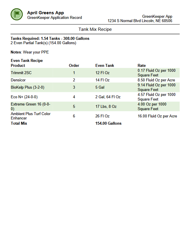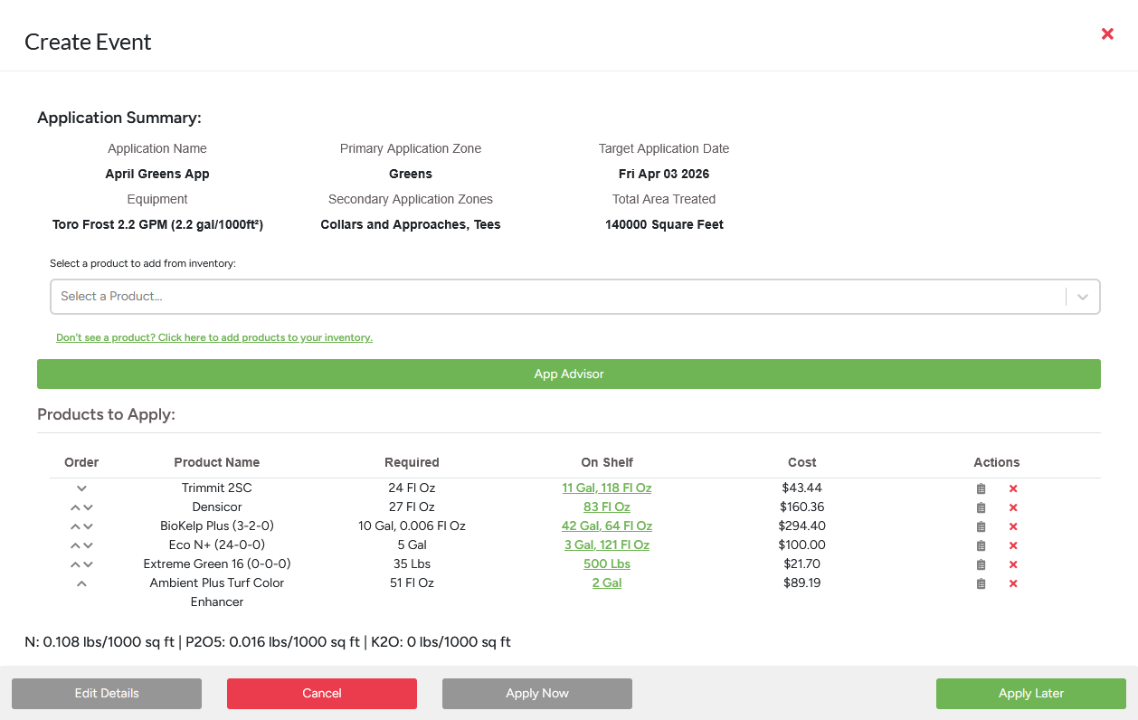 Liquid fertilizers add mixing math complexity because volume doesn’t tell you much about nutrient load. GreenKeeper handles that conversion automatically, giving you a clear nutrient summary when you finalize the application.