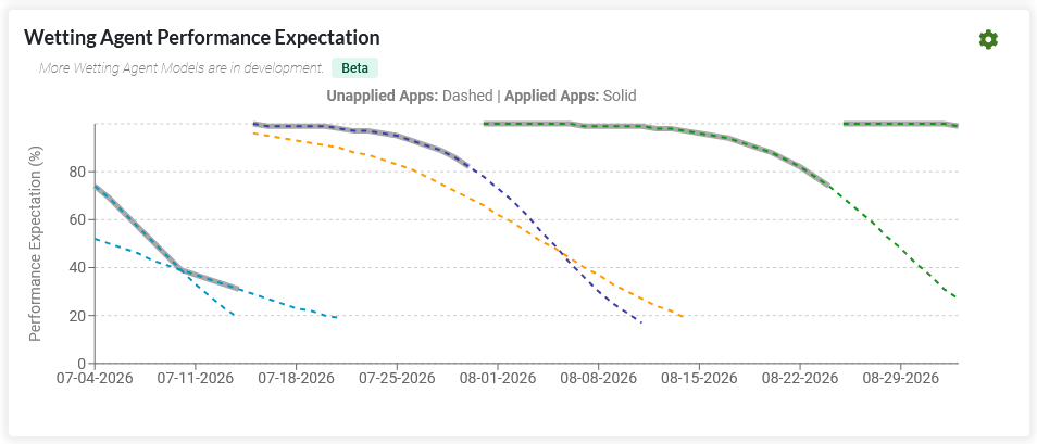 Wetting agent longevity declines as air and soil temperatures rise through the season. GreenKeeper’s wetting agent models account for that variability, giving you confidence that your program is maintaining soil wettability when it matters most without making costly unnecessary applications when it doesn’t.