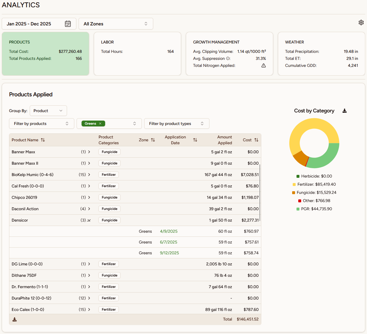 Nobody enjoys managing inventory, but club managers and controllers increasingly want visibility into what’s being used, when, and what it costs. GreenKeeper keeps that information current without extra work. Product costs are visible while building an application, and once it’s logged, inventory levels adjust automatically. The Analytics page gives you a clear view of chemical expenses over time.